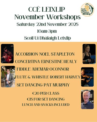 CCÉ Leixlip are excited to announce the return of our November Workshop series with a stunning line-up! Workshops will take place on Saturday the 22nd of November from 10AM-3PM in Scoil Uí Dhálaigh Leixlip. This is certainly not to be missed!